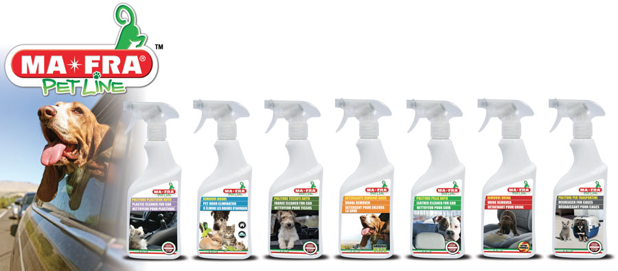 La gamma di prodotti Pet Line Car Nasce dall’esigenza di trasportare i pet in auto, dove possono capitare piccoli inconvenienti. Per questa ragione Mafra ha realizzato, sfruttando il proprio know-how e la propria esperienza nel campo della pulizia dell’auto, una linea di detergenti altamente performanti, per pulire l’auto (la pelle, le plastiche, i vetri, i sedili di qualsiasi materiale) in caso di imprevisti (bava, urina, fango, polvere) lasciati dagli amici a 4 zampe durante i viaggi. Tutti i detergenti Mafra sono sicuri per i pet che per le varie superfici dell’auto. La gamma Car composta da: