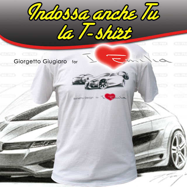 Dai anche tu il tuo contributo indossando la t-shirt I Love Emilia con la stampa del bozzetto auto donato da Giorgetto Giugiaro!